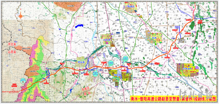 衡水-昔陽(yáng)高速公路趙縣至贊皇(冀晉界)段起于趙縣謝莊鎮(zhèn)小郝莊村北,與在建的石衡高速公路相接,路線途經(jīng)趙縣、高邑、贊皇三縣,終點(diǎn)位于贊皇縣虎寨口村西,與在建的山西省昔榆高速公路以隧道形式相接,總體呈東西走向。